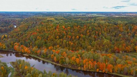 Aerial view of the river in the autumn forest. Colorful autumn landscape.