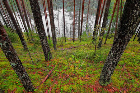 forest in summer morning. far horizon. spruce and pine tree forest abstract texture background