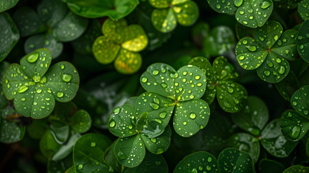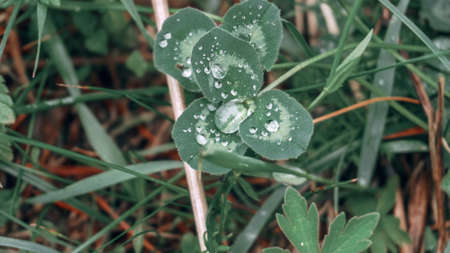 Green clover leaves with water drops after rain
