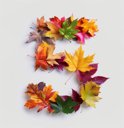 A vibrant assortment of autumn leaves in various shades of red, orange, and green creatively arranged to shape the number five, showing the beauty of fall foliage.