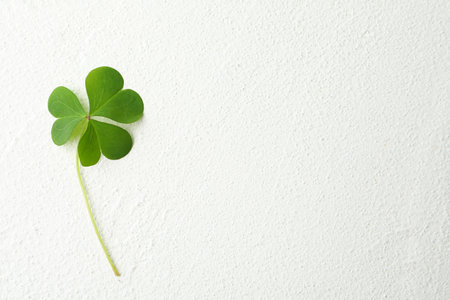 Clover leaf on white table, top view with space for text. St. Patrick's Day symbol