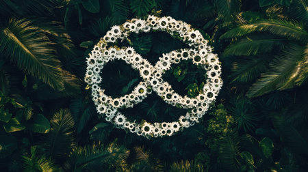 An aerial shot showcasing a design of white interlocking gears nestled within vibrant green tropical foliage. It symbolizes the harmonious blend of nature and technology.