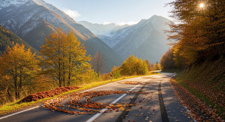 Under showing winding mountain road in autumn with falling leaves and snow-capped peaks under a bright blue sky....