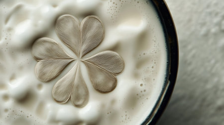 Intricate coffee art in a creamy beverage shaped like a four-leaf clover. A four-leaf clover in a cup of coffee creamy, white background