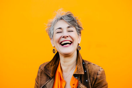 A woman is shown laughing with her eyes closed, illuminated by soft natural light. She wears a neutral-toned sweater, conveying a relaxed and approachable mood. The composition emphasizes emotional expression, suitable for various editorial and commercial applications. The neutral background and lighting provide ample copy space.