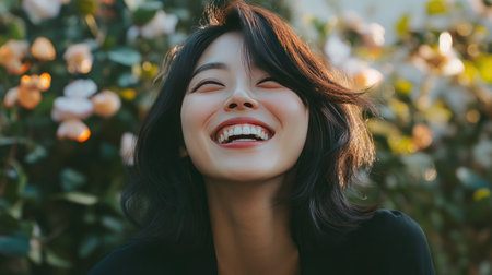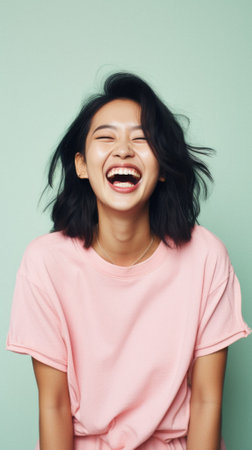 A happy Korean woman with shoulder-length hair laughing. Joy, happiness, portrait.