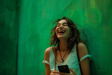 A young woman stands against a vivid green wall, her infectious laughter filling the air as she glances at her phone. The warm hues of dusk light up her joyful demeanor, creating a lively ambiance.