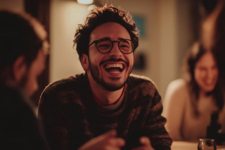 Young man laughing joyfully while enjoying video games with friends at home, creating a lively atmosphere filled with fun and connection