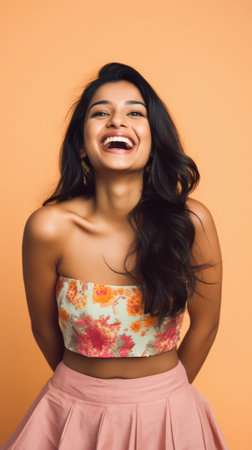 Portrait of beautiful Indian american joyful optimistic positive woman laughing