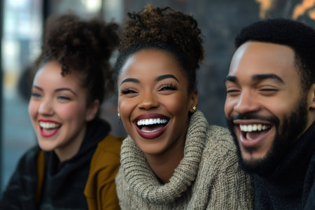 A diverse group of friends laughing and enjoying a joyful moment outdoors in a warm atmosphere