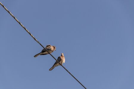 Pigeons, birds, sit on power line in Cape Town, South Africa.