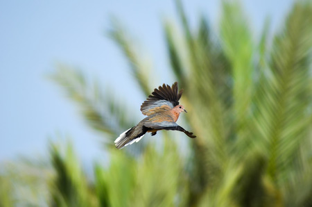 A dove flew over the green palm trees. Egypt, Sharm El Sheikh.