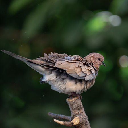 Laughing dove looks away while cleaning feathers on a branch. Bird in the wild on a blurred dark green background with bokeh. Square photo of Spilopelia senegalensis
