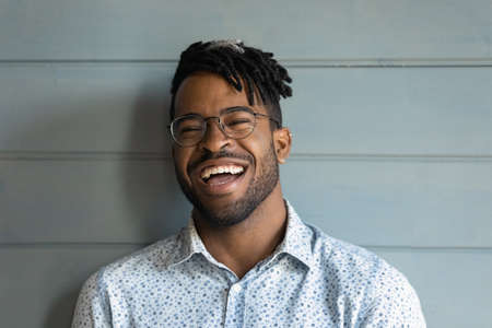 Close up of overjoyed millennial biracial man in glasses isolated on grey wooden wall background laugh at funny joke. Excited happy young 20s Africana American male in eyewear have fun. Humor concept.