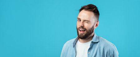 Man With Beard Winks Playfully Against a Bright Blue Background During Casual Setting