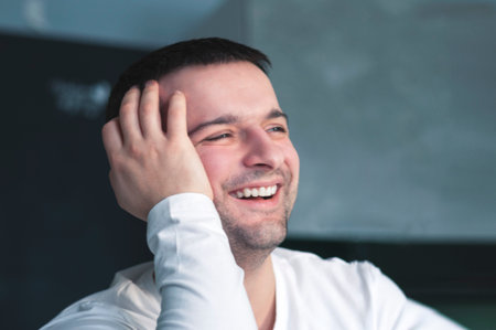 Young man smiling and enjoying happy moments outdoors in a sunny park