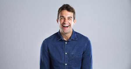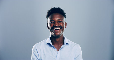 Portrait, humor and man in studio, smile and laughing with positive mindset on gray background space. Face, happy person or model with confident personality, joke and funny with comic or fun attitude