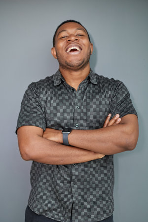 Close up portrait of handsome young african american man laughing and looking away against gray background