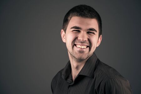 Smile, and the whole world smiles with you. Portrait of a happy young man posing against a dark background in studio.