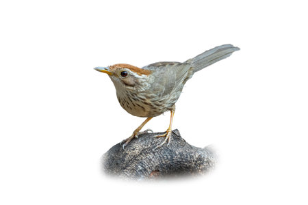 Puff-throated Babbler perching on a tree trunk isolated on white background