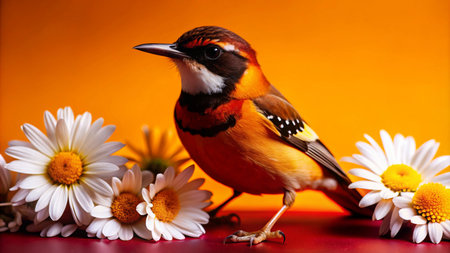 A colorful bird perched on a branch with delicate white flowers blooming. The bird's vibrant plumage contrasts beautifully with the soft green background.