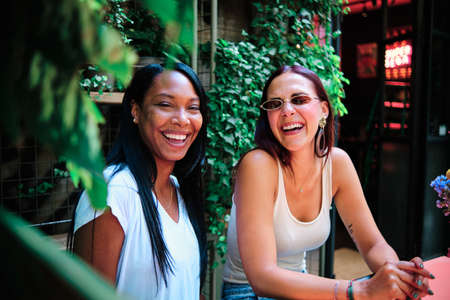 happy woman with different skin color friend spending good time together; concept of ethnicity and skin color difference tolerance, love and peace, friendship, social diversity