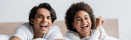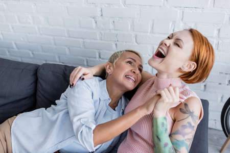 cheerful woman laughing near lesbian girlfriend on couch at home