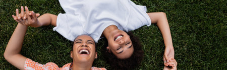 top view of positive african american lesbian women holding hands and lying on grass, banner