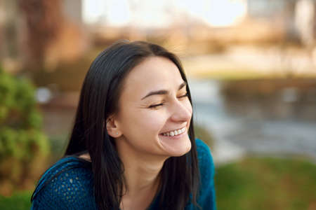 Young woman smiling outdoor. Beautiful brunete girl resting on park or garden green background. Free happy woman at summertime. Freedom happiness carefree happy people concept