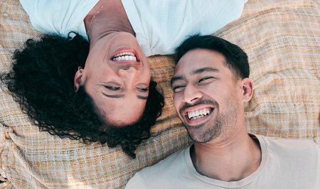 Face, picnic and smile with a couple laughing on a blanket from above, lying on the ground while on a date. Love, happy or funny with a man and woman bonding together for romance on valentines day