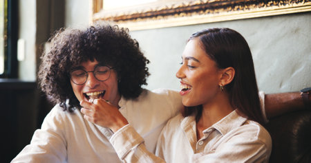 Date, feeding and food with couple in coffee shop together for bonding, love or romance. Bite, happy or snack with man and woman in booth of cafe or restaurant for hospitality, relax and service