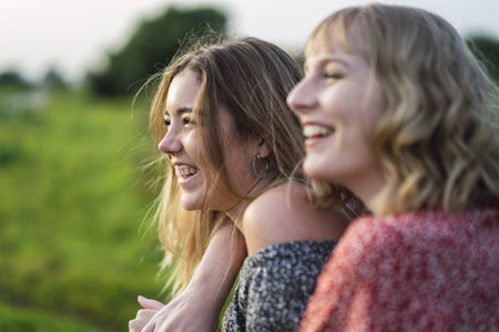 Friends having fun outdoors. Two beautiful girls lying next to the river and looking at each other. Laughing while enjoying the evening by the water. Lifestyle.Look from above