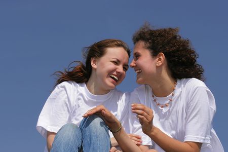 Portrait of two young girls smiling on the beach. Normal female couple. Concept of happiness and joy.