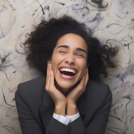 A man laughs heartily, his eyes closed in a moment of pure joy. The portrait captures a range of emotions with warm tones and soft lighting, enhancing the feeling of happiness. This image could be used for various commercial projects related to joy, well-being, or emotional expression.