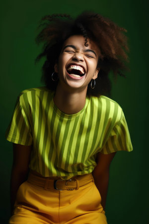 Young happy african american woman smiling over green background. Emotions concept. Generative AI