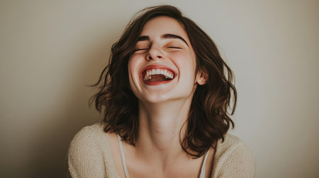 A candid photo of a woman laughing with her eyes closed, showcasing her genuine happiness and beauty in a casual, everyday moment