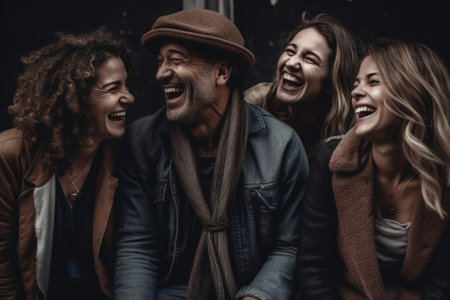 A group of people of different nationalities laughing. Different ages nationalities having fun together, having good time together laughing smiling. Enjoyment, relaxation respect peace. Generative AI.