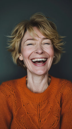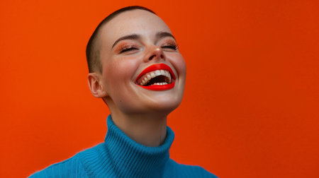 Vivid Expression: Joyful Woman with Glitter Makeup Laughing on Orange Background