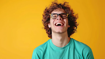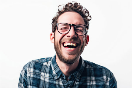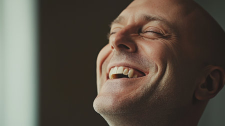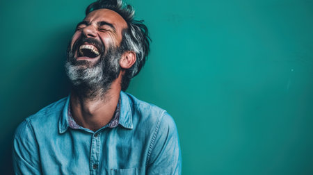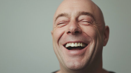 A man displays pure joy, laughing heartily with his eyes closed and a wide smile. The neutral backdrop emphasizes his cheerful expression and delightful demeanor.