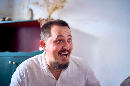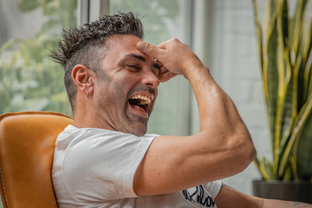 A middle-aged man is enjoying a moment of laughter indoors, with sunlight streaming through the window. His joyful expression reflects a happy and relaxed mood.