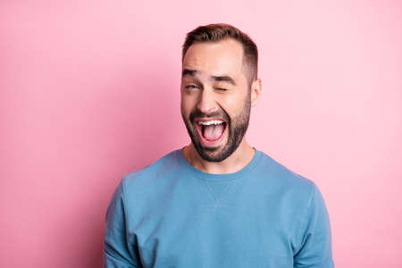 Photo of sweet charming young guy wear blue pullover winking open mouth isolated pink color background