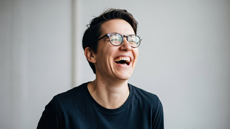 A person is captured mid-laugh, radiating happiness. The individual wears glasses and dark-colored clothing. Soft, natural lighting bathes the scene, highlighting facial expressions. This image could be suitable for various commercial and editorial applications to convey joy or positive emotions.