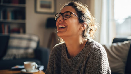 A woman is laughing in an indoor setting. She is wearing glasses and a sweater, with her face illuminated by daylight. The composition includes soft textures and warm colors, suggesting a comfortable environment. This image could be used for various commercial and editorial projects.