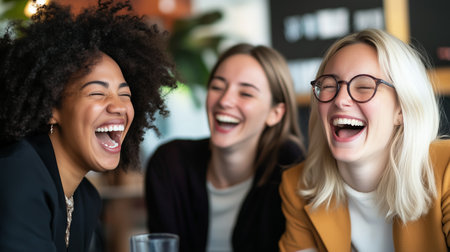 Three friends laughing together in a cozy café during a sunny afternoon, enjoying a moment of joy and connection