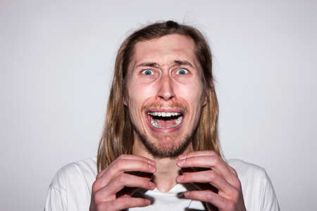Frightened man. Emotion of fear. Scared screaming male, threaten concept