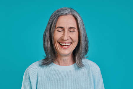 Headshot of mature beautiful woman laughing while standing against blue background