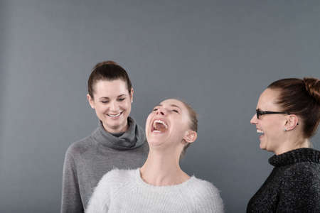 Young women laughing, grey background