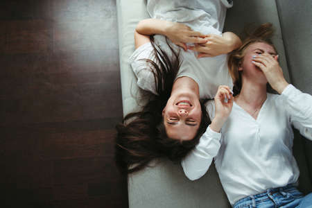 Two young female girlfriends sitting together
