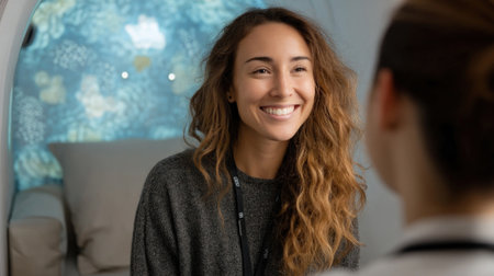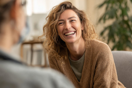 Two friends engage in a warm conversation, sharing smiles and laughter in a bright, inviting indoor setting, creating a feeling of connection and joy.