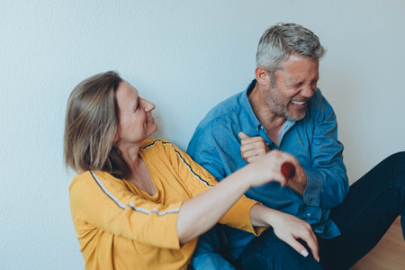 A happy couple is having fun at home while sitting on the floor.